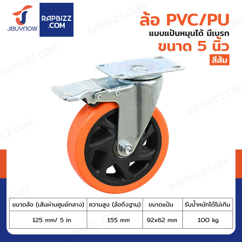 ล้อ 5 นิ้ว แป้นเป็น มีเบรก PVC/PU สีส้ม JBUYNOW JF-1449125