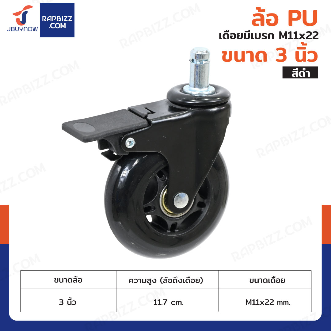 ล้อ PU 3 นิ้ว เดือยมีเบรก M11x22 สีดำ