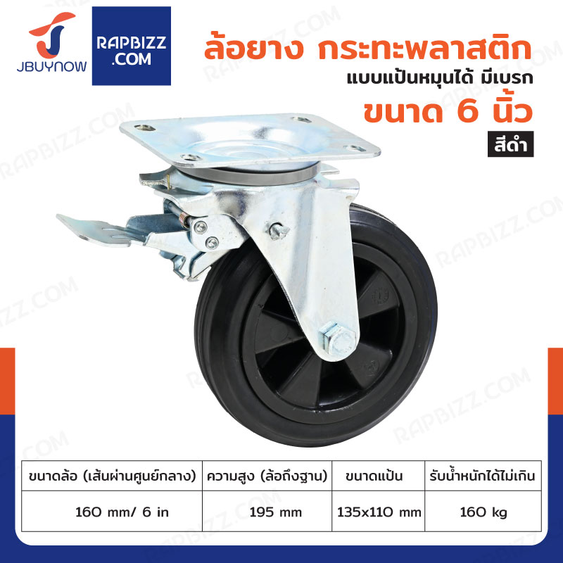 ล้อรถเข็น 6 นิ้ว กระทะพลาสติก แป้นเป็น มีเบรก JBUYNOW JF-1115160
