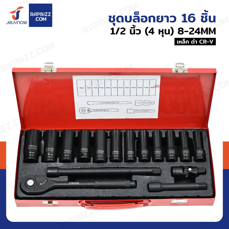 ชุดบล็อก ยาว 16 ชิ้น 1/2 นิ้ว (4 หุน) 8-24MM เหล็ก ดำ CR-V JBUYNOW SRUNV A2-D01205