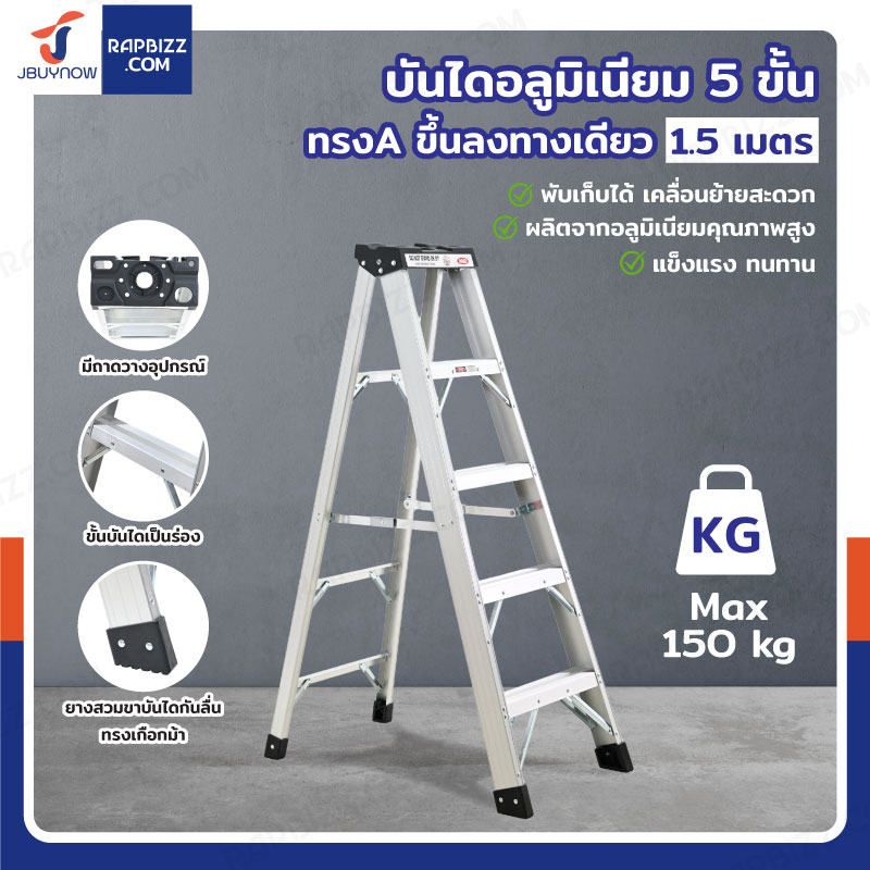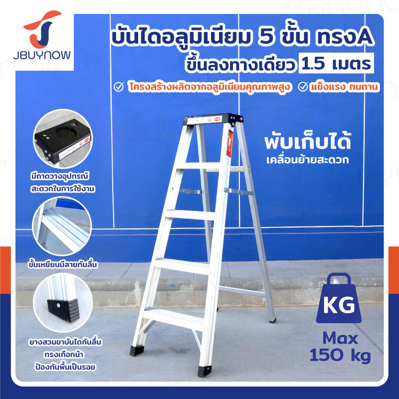 บันได อลูมิเนียม 5 ขั้น 1.5 เมตร ทรงAขึ้นลงทางเดียวมีที่วางอุปกรณ์ JBUYNOW ARD-15