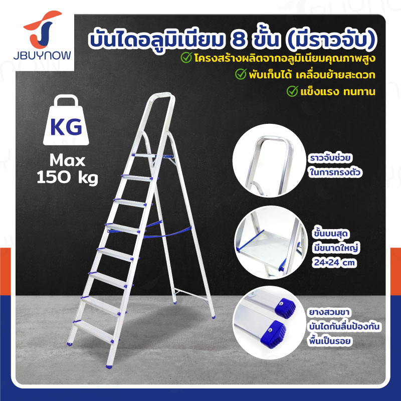 บันได อลูมิเนียม พับเก็บได้ 8 ขั้น 2 เมตร มีราวจับ รับน้ำหนักได้ 150 KG JBUYNOW KND-8