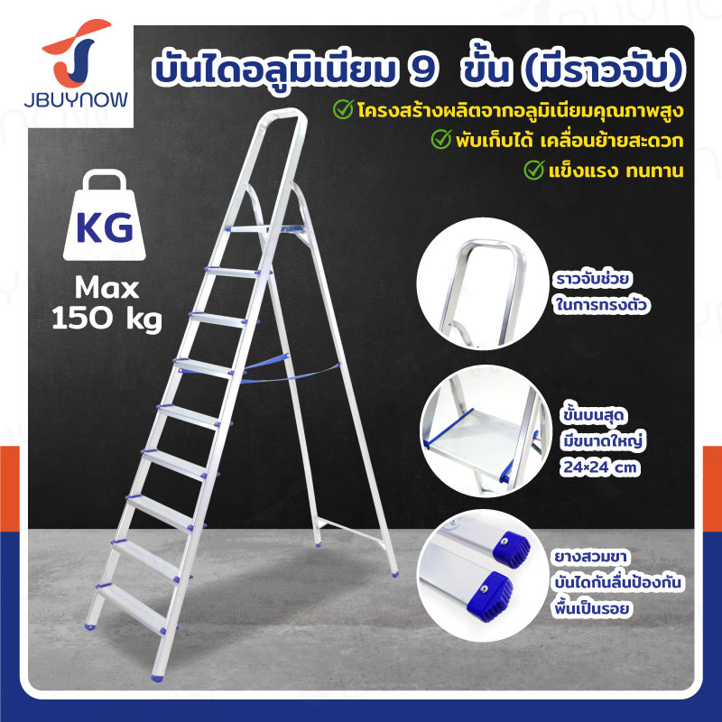 บันได อลูมิเนียม พับเก็บได้ 9 ขั้น 2.2 เมตร มีราวจับ รับน้ำหนักได้ 150 KG JBUYNOW KND-9