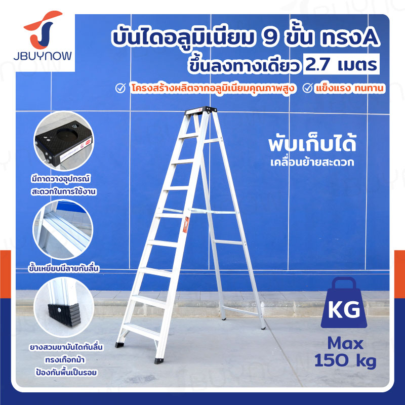 บันได อลูมิเนียม 9 ขั้น 2.7 เมตร ทรงA ขึ้นลงทางเดียว มีที่วางอุปกรณ์ JBUYNOW ARD-27