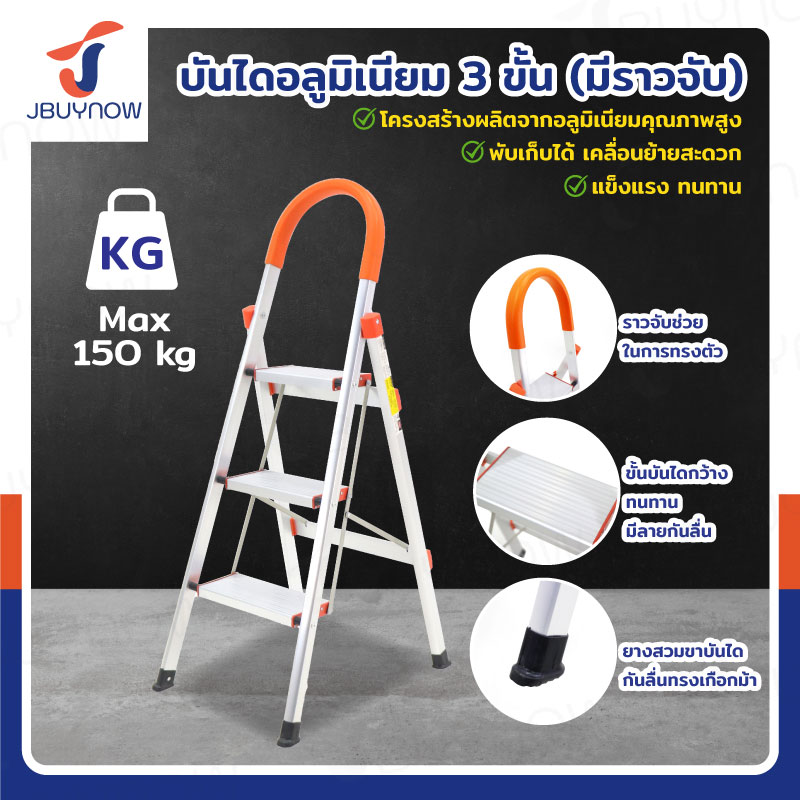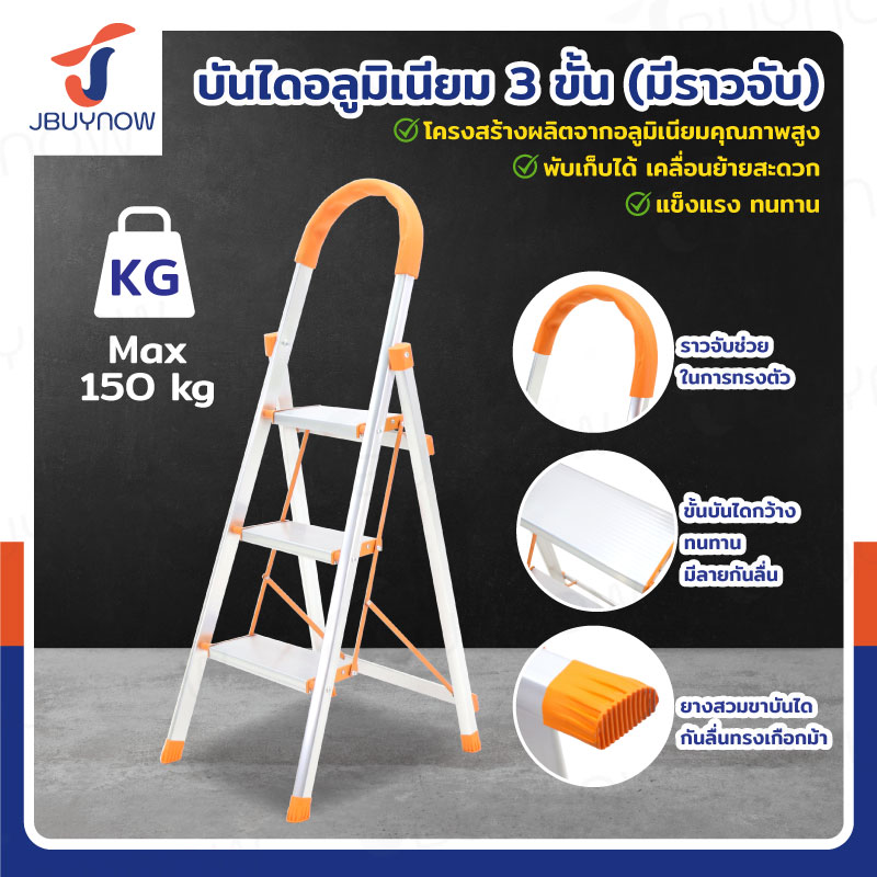 บันได อลูมิเนียม พับเก็บได้ 3 ขั้น 1.2 เมตร มีราวจับ รับน้ำหนักได้ 150 KG สีส้ม JBUYNOW DLB-3
