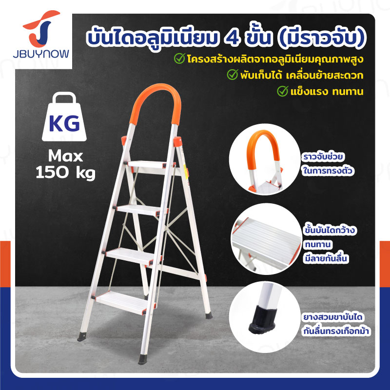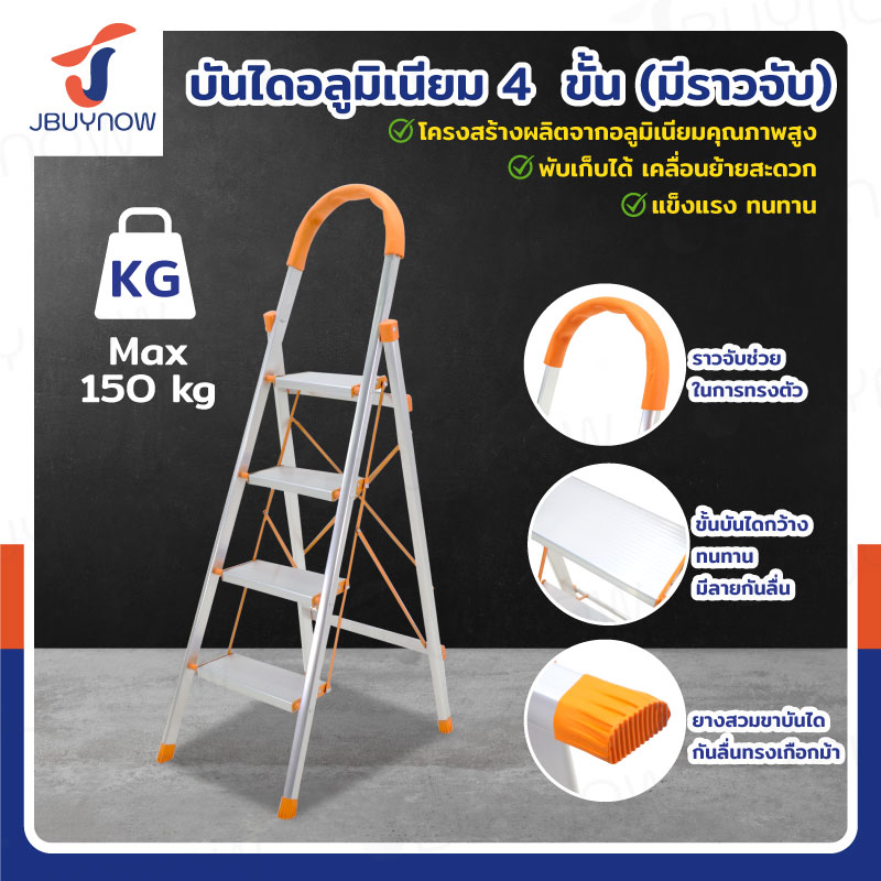 บันได อลูมิเนียม พับเก็บได้ 4 ขั้น 1.4 เมตร มีราวจับ รับน้ำหนักได้ 150 KG สีส้ม JBUYNOW DL-4