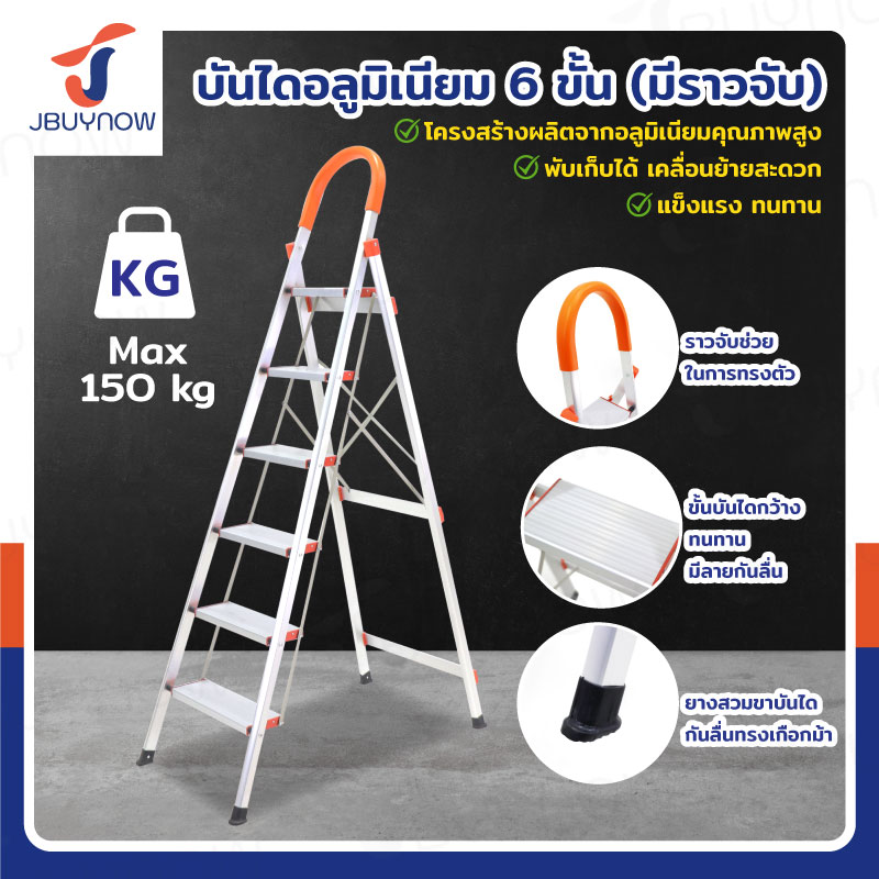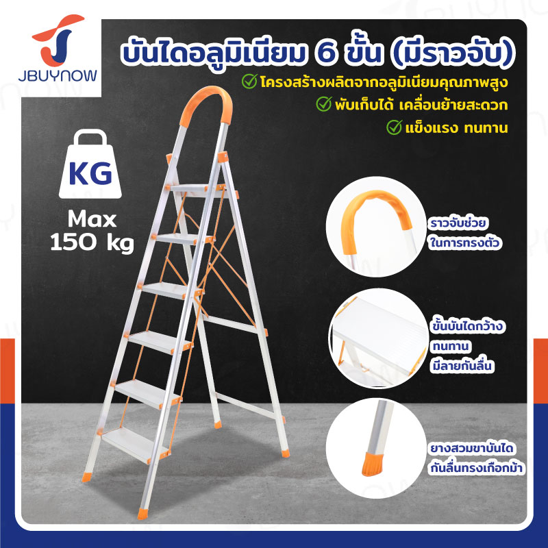 บันได อลูมิเนียม พับเก็บได้ 6 ขั้น 1.9 เมตร มีราวจับ รับน้ำหนักได้ 150 KG สีส้ม JBUYNOW DL-6