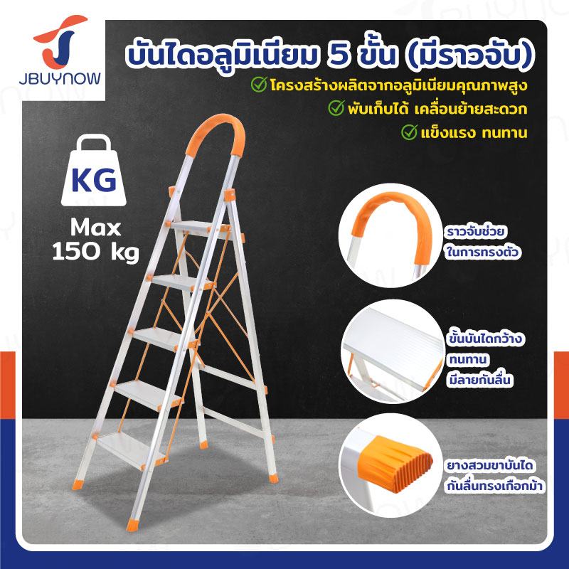บันได อลูมิเนียม พับเก็บได้ 5 ขั้น 1.6 เมตร มีราวจับ รับน้ำหนักได้ 150 KG สีส้ม JBUYNOW DL-5