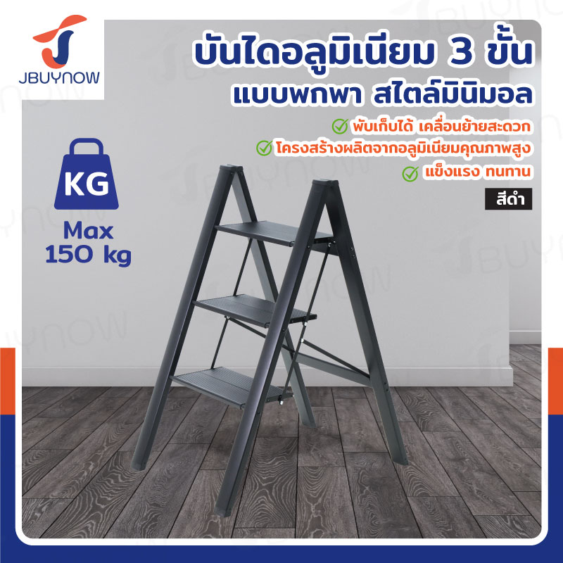 บันไดอลูมิเนียม 3 ขั้น 0.8 เมตร แบบพกพา สไตล์มินิมอล สีดำ JBUYNOW HJ-3B
