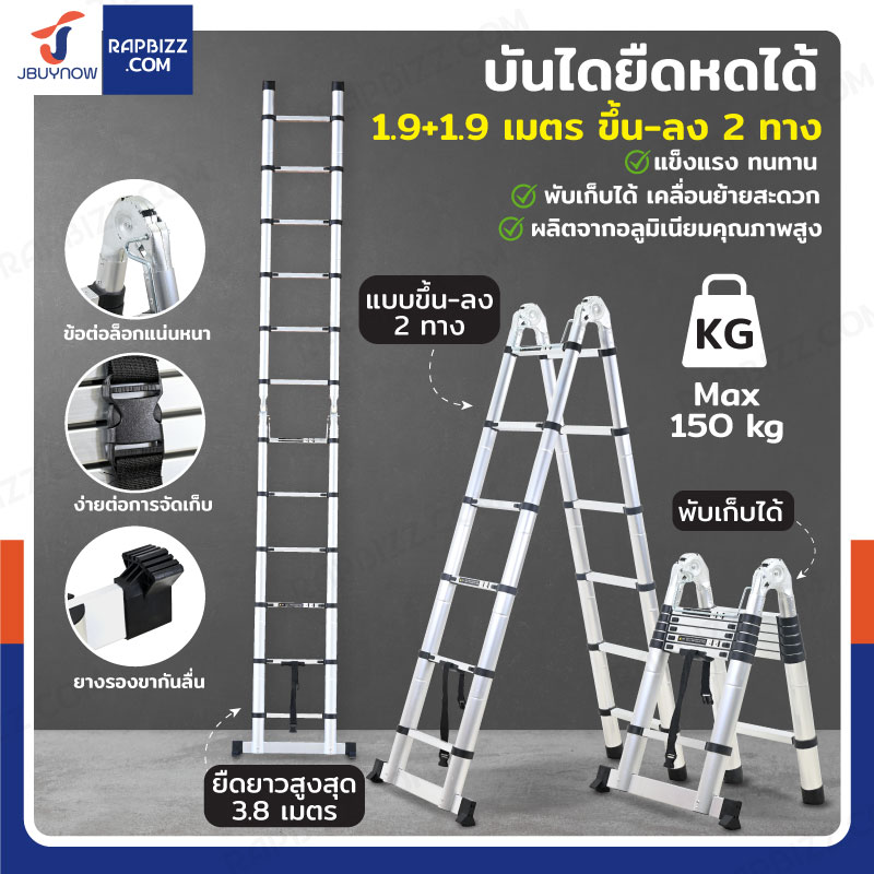 บันไดยืดหดได้ 1.9+1.9 เมตร ขึ้น-ลง 2 ทาง บันได อลูมิเนียม พับได้ ยืดสไลด์