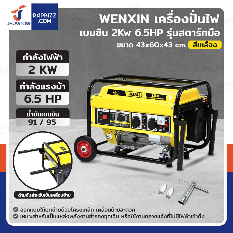 เครื่องปั่นไฟ เบนซิน 2Kw 6.5HP 4จังหวะ มอเตอร์ลวดอลูมิเนียม รุ่นสตารท์มือ สีเหลือง WENXIN WX-2KW