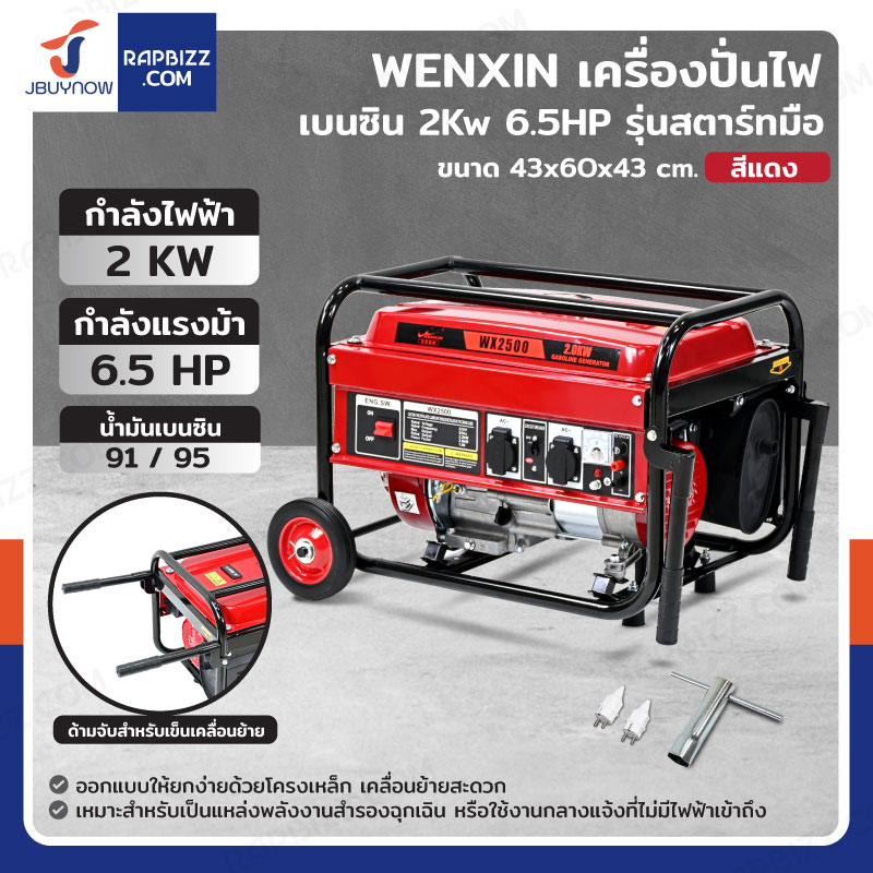 เครื่องปั่นไฟ เบนซิน 2Kw 6.5HP 4จังหวะ มอเตอร์ลวดทองแดง รุ่นสตารท์มือ สีแดง WENXIN WX-2KW(COPPER)