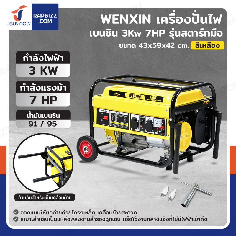 เครื่องปั่นไฟ เบนซิน 3Kw 7HP 4จังหวะ มอเตอร์ลวดอลูมิเนียม รุ่นสตารท์มือ สีเหลือง WENXIN WX-3KW