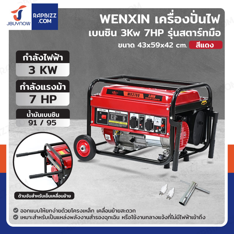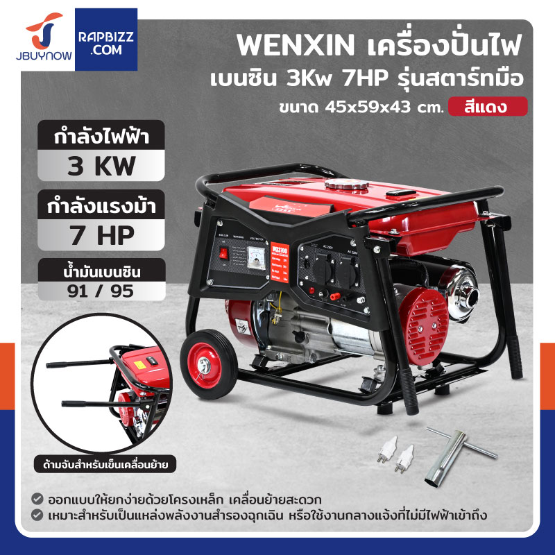 เครื่องปั่นไฟ เบนซิน 3Kw 7HP 4จังหวะ มอเตอร์ลวดทองแดง รุ่นสตารท์มือ สีแดง WENXIN WX-3KW(COPPER)
