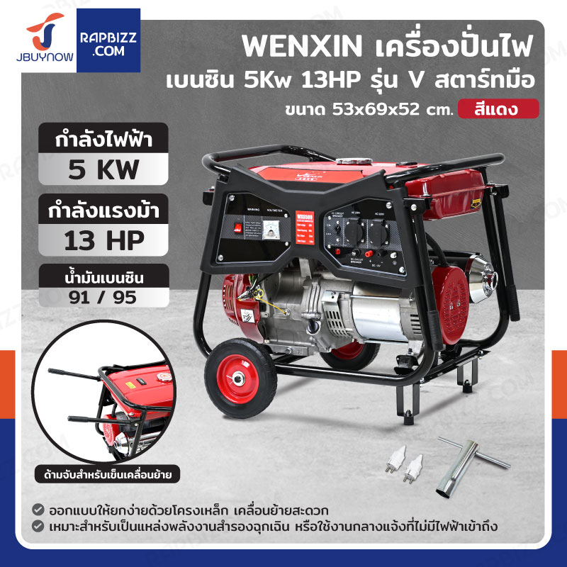 เครื่องปั่นไฟ เบนซิน 5Kw 13HP 4จังหวะ มอเตอร์ลวดทองแดง รุ่นV สีแดง WENXIN WX-V5KW(COPPER)