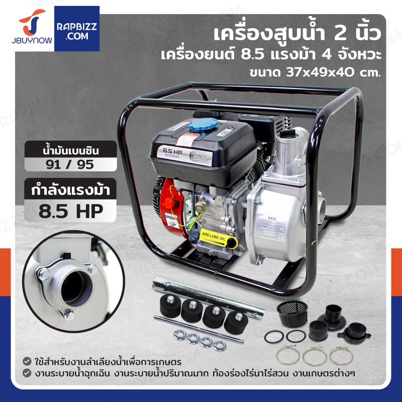 เครื่องสูบน้ำเบนซิน 2 นิ้ว 8.5HP 3600rmp ปั๊มใหม่ แรงดันสูง 4จังหวะ ปั๊มชนเครื่อง