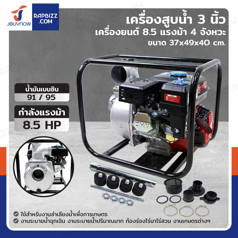 เครื่องสูบน้ำเบนซิน 3 นิ้ว 8.5HP 3600rmp ปั๊มใหม่ แรงดันสูง 4จังหวะ ปั๊มชนเครื่อง