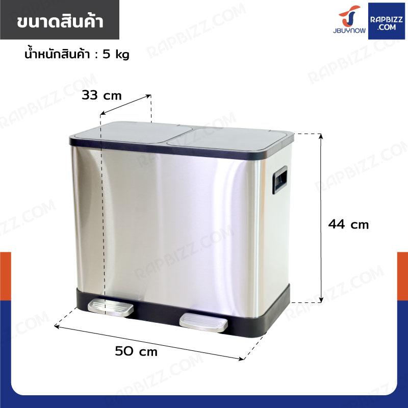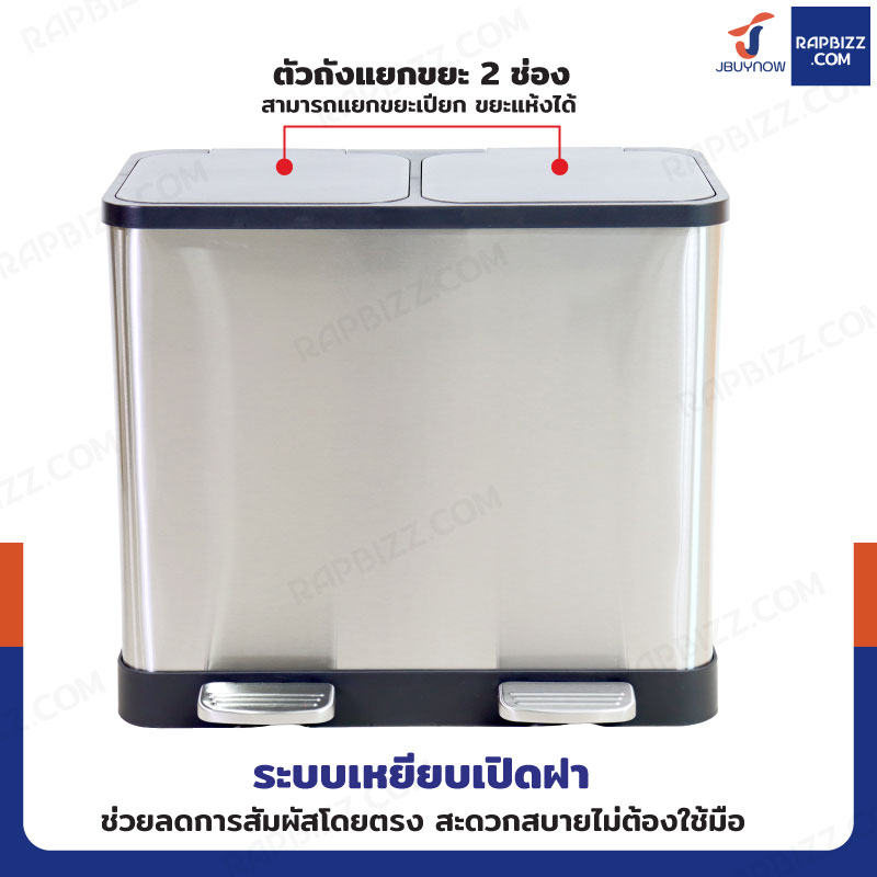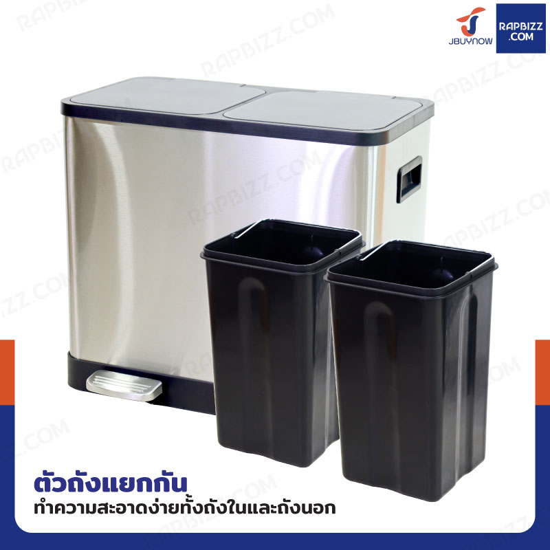 ถังขยะสแตนเลส 2 ช่อง แบบเหยียบ ทรงเหลี่ยม 30 ลิตร (ช่องละ 15 ลิตร) 33x50x44 cm