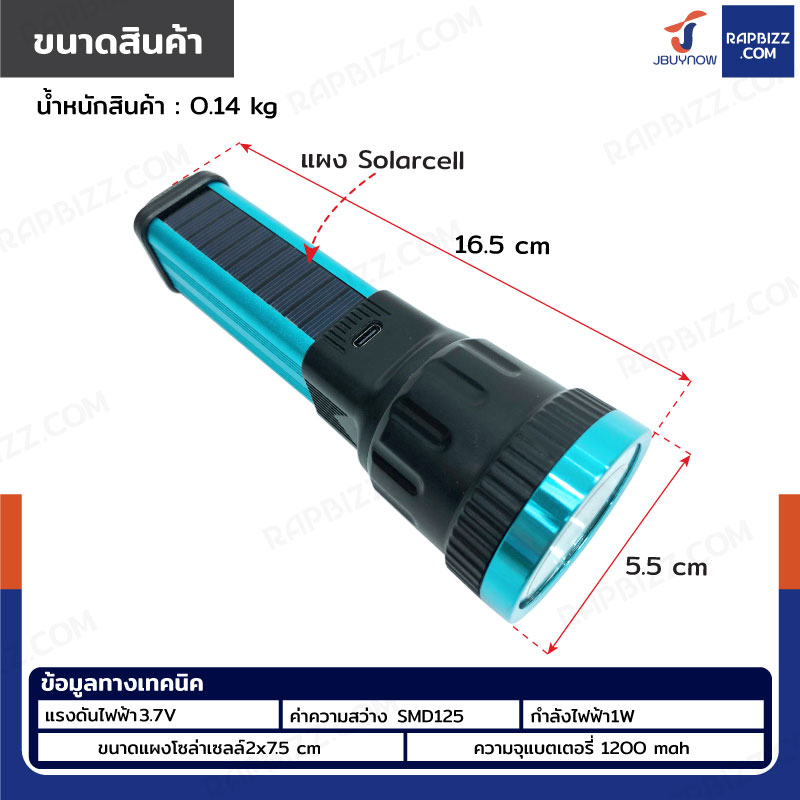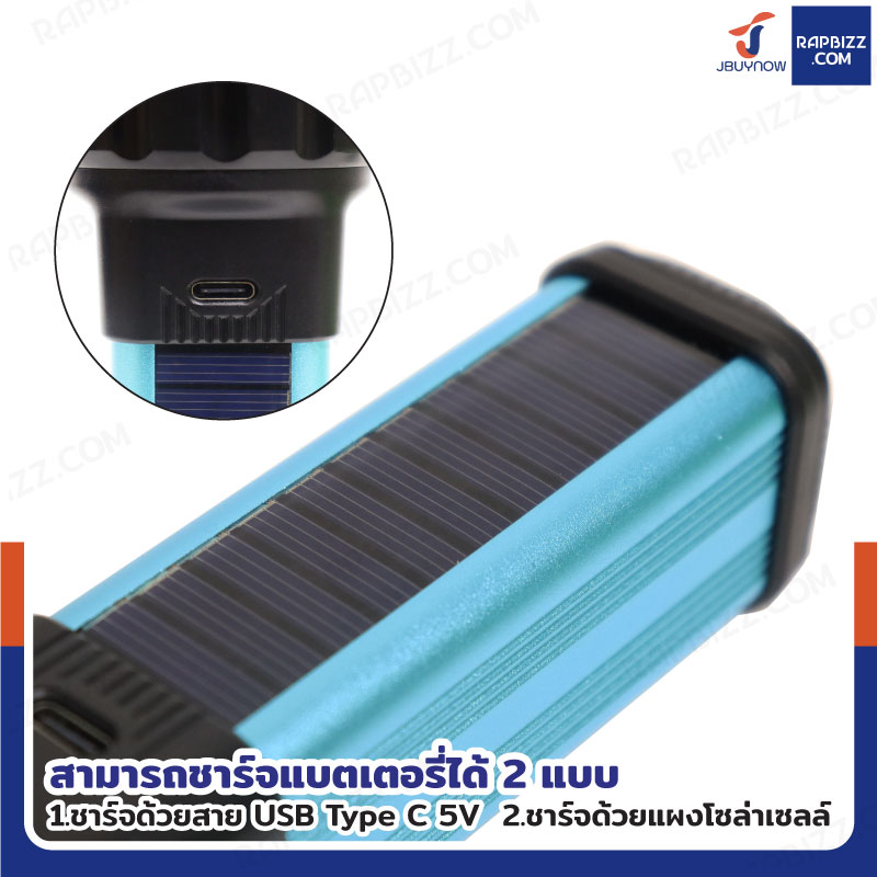 ไฟฉายชาร์จ USB โซล่าเซลล์ 3.7V 1200mah สีฟ้า