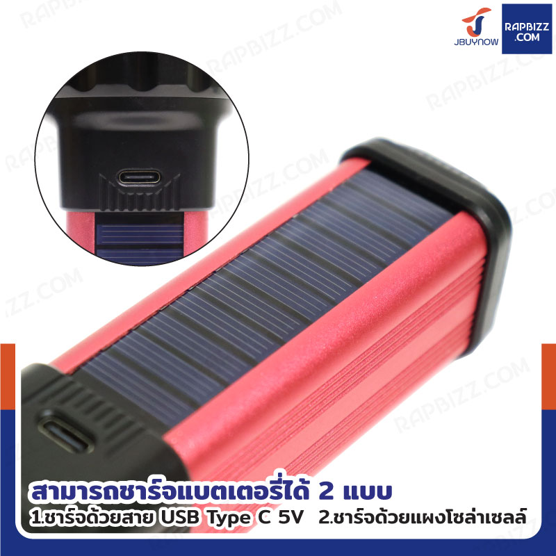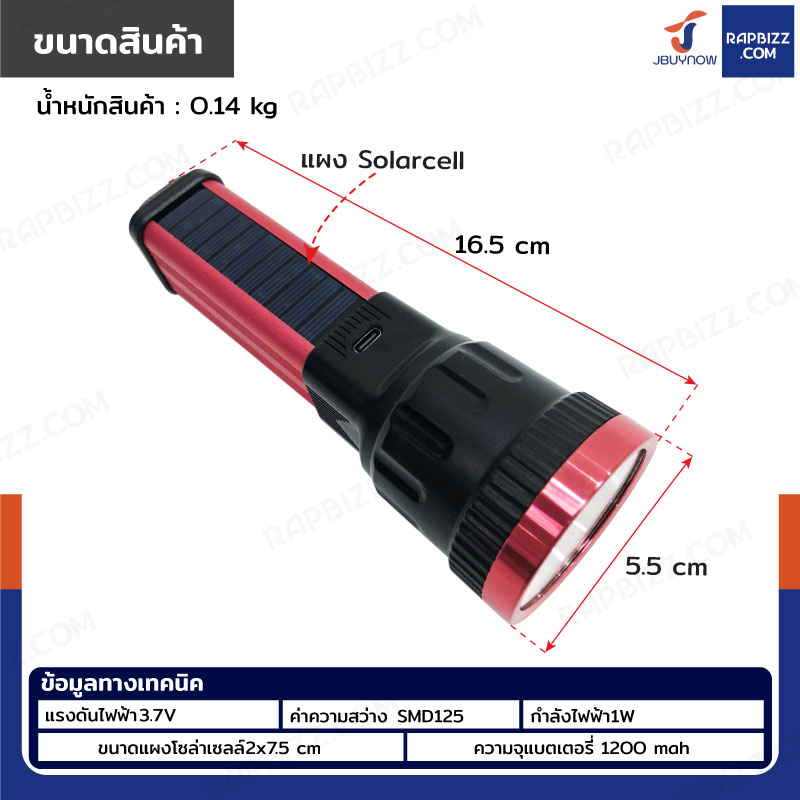 ไฟฉายชาร์จ USB โซล่าเซลล์ 3.7V 1200mah สีแดง