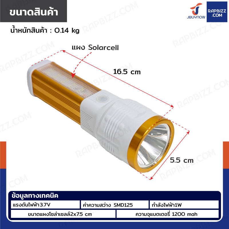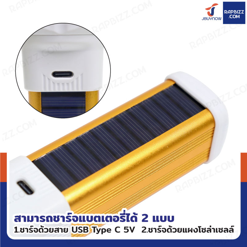 ไฟฉายชาร์จ USB โซล่าเซลล์ 3.7V 1200mah สีทอง