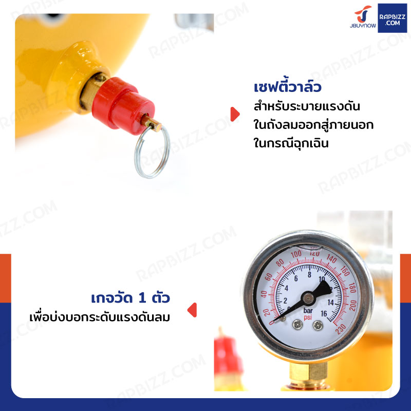- มีเซฟตี้วาล์วสำหรับระบายแรงดันในถังลมออกสู่ภายนอกในกรณีฉุกเฉิน