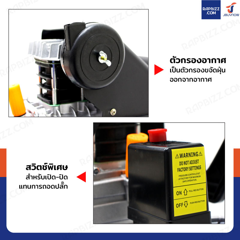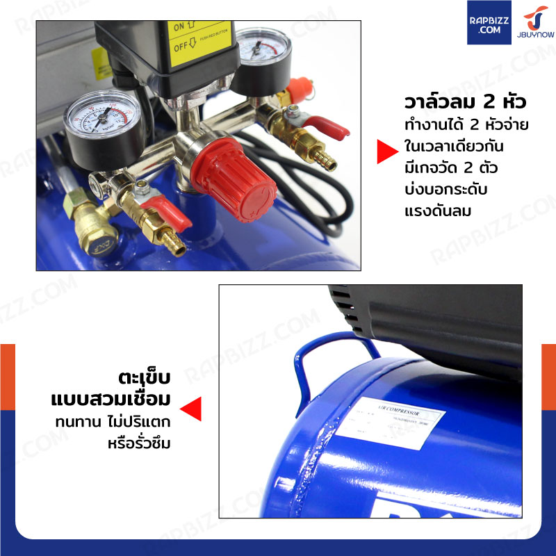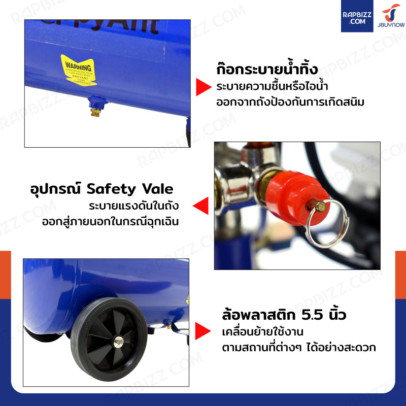 - มีก๊อกระบายน้ำทิ้ง,ระบายความชื้นหรือไอน้ำออกจากถังลมเพื่อป้องกันการเกิดสนิม