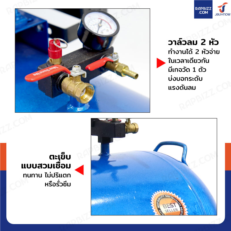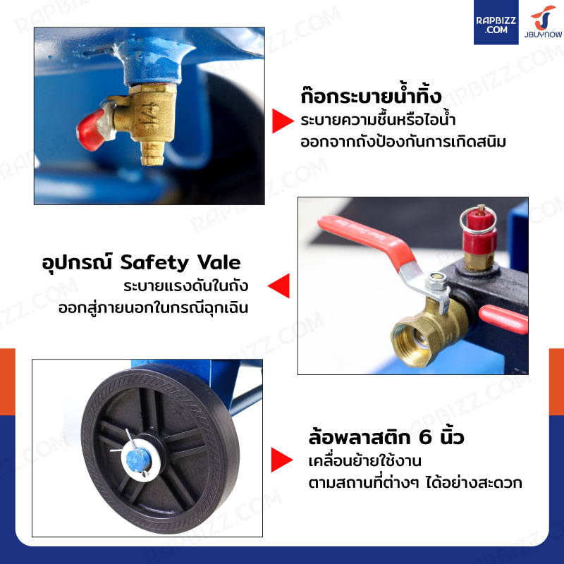 - มีก๊อกระบายน้ำทิ้ง, ระบายความชื้นหรือไอน้ำออกจากถังลมเพื่อป้องกันการเกิดสนิม