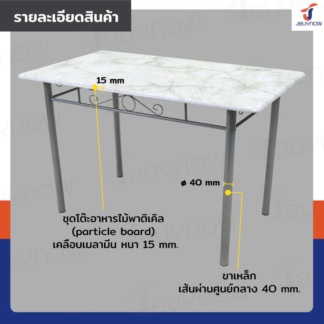 - ชุดโต๊ะอาหารไม้พาติเคิล (particle board) เคลือบเมลามีน ป้องกันการหลุดลอก ขีดข่วน และน้ำซึม