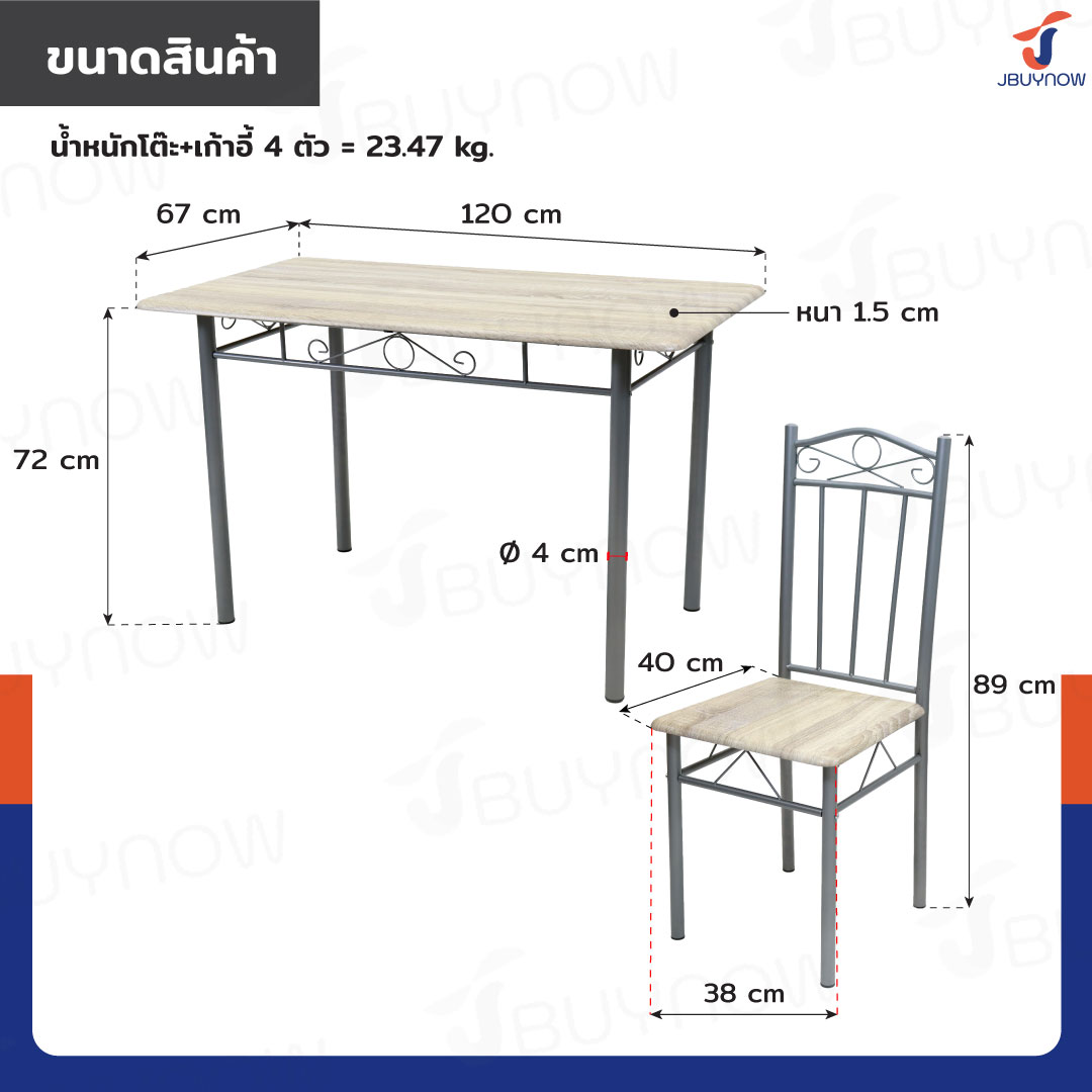 ชุดโต๊ะรับประทานอาหาร โต๊ะกินข้าว 4 ที่นั่ง 120x67x72 ซม. 1202-160