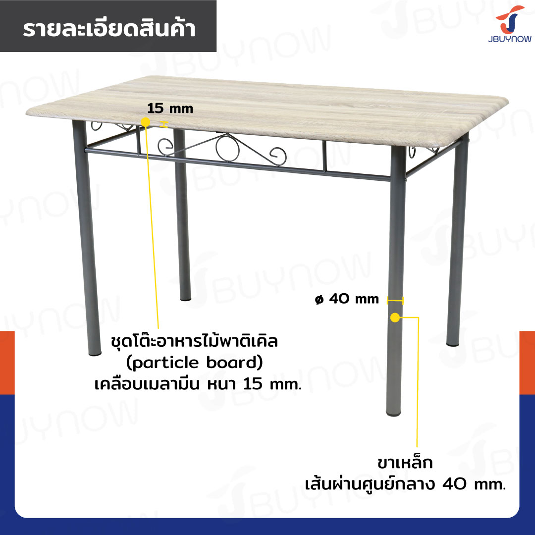 - ชุดโต๊ะอาหารไม้พาติเคิล (particle board) เคลือบเมลามีน ป้องกันการหลุดลอก ขีดข่วน และน้ำซึม