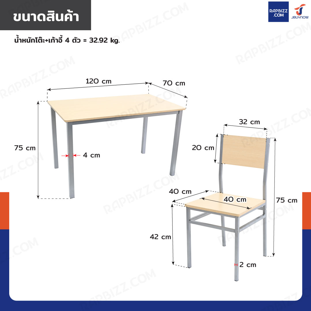 - ขนาดเก้าอี้: 40x40x83 cm/ตัว