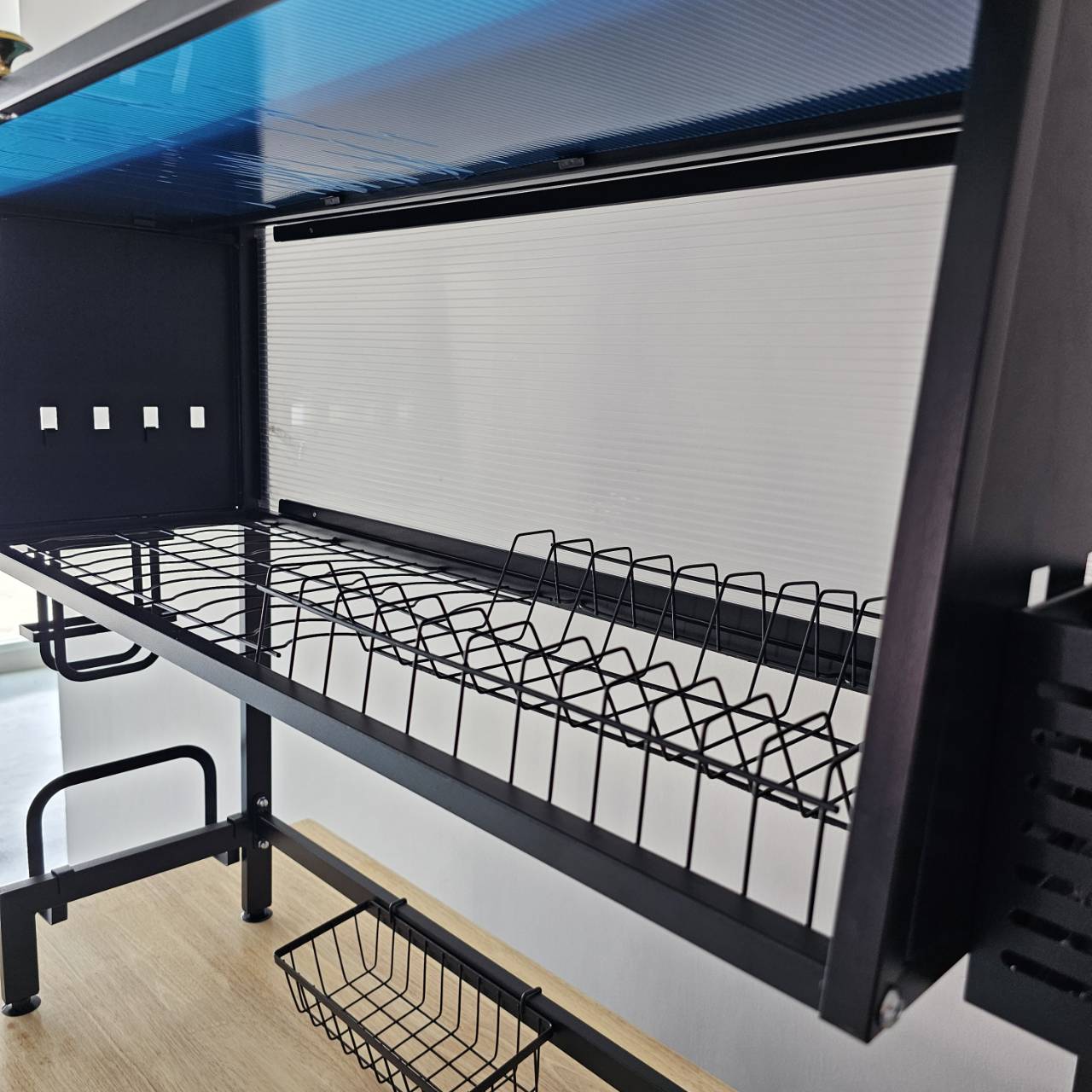 - สินค้ามาพร้อมอุปกรณ์ครบชุด คือ ที่วางมีด ,ที่วางเขียง ,ตะกร้าสําหรับใส่ผลิตภัณฑ์ทำความสะอาด ,ตะขอแขวน 4 ตัว