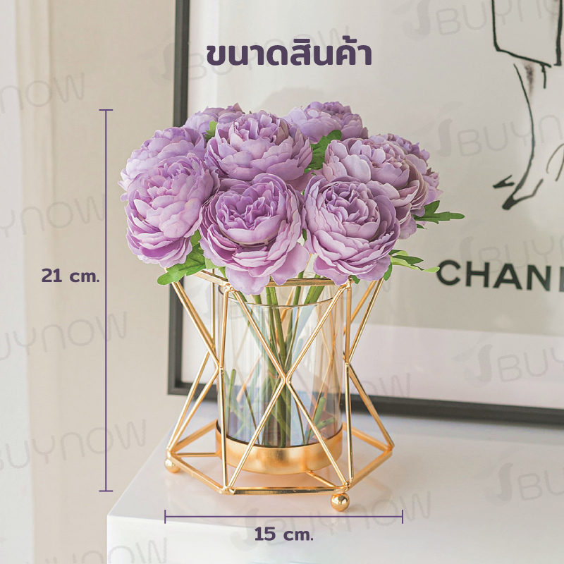 - ดอกไม้ทำจากพลาสติก ดอกโบตั๋นสีม่วง 9 ดอก