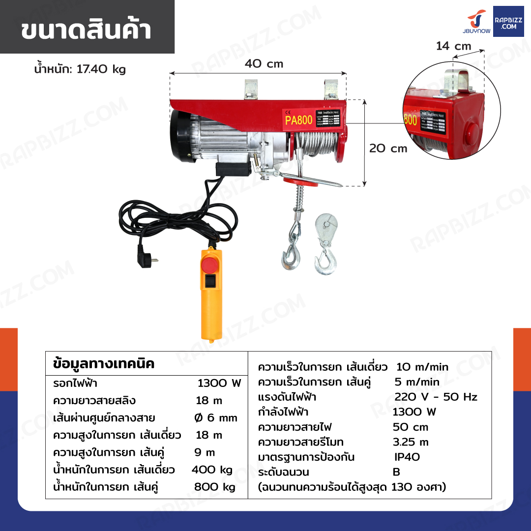 รอกไฟฟ้า รอกสลิงไฟฟ้า 800 Kg.1300 W สลิง 6 mm. ยาว 18 M JBUYNOW PA800