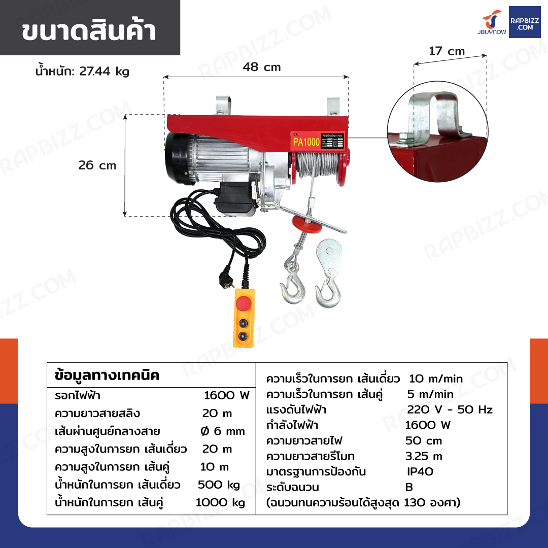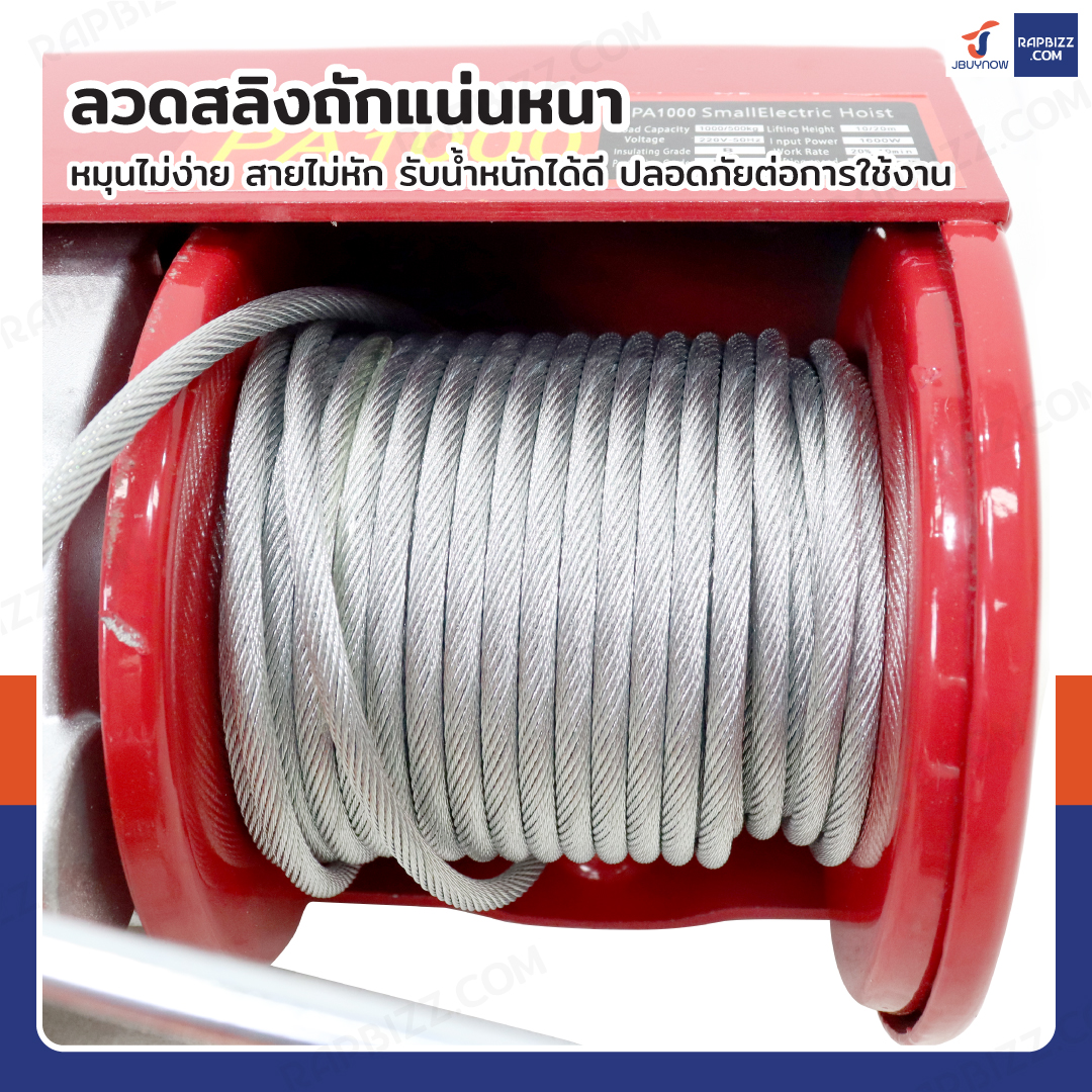 รอกไฟฟ้า รอกสลิงไฟฟ้า 1000 Kg.1600 W สลิง 6 mm. ยาว 20 M JBUYNOW PA1000