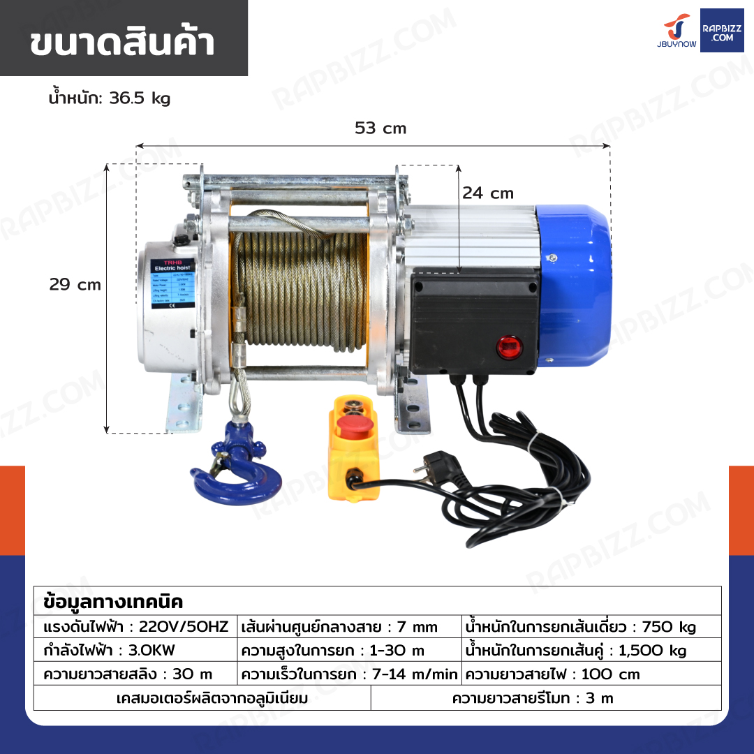 รอกไฟฟ้า รอกสลิงไฟฟ้า รุ่นงานหนัก 1.5 ตัน มอเตอร์ 3.0KW สลิง 7mm/30m สายรีโมท 3M