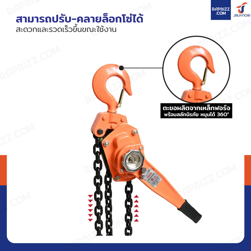 - ตะขอผลิตจากเหล็กฟอร์จ พร้อมสลักนิรภัย หมุนได้ 360 องศา