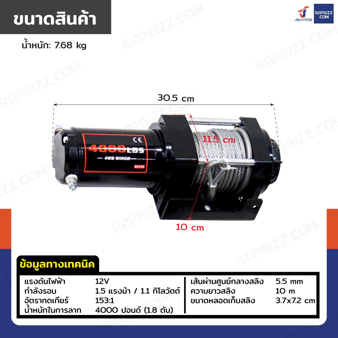 วินซ์ติดรถ 1.8 ตัน/4000 ปอนด์ มอเตอร์ 1.6hp/1.2Kw/12V สลิง 10M 4000-W