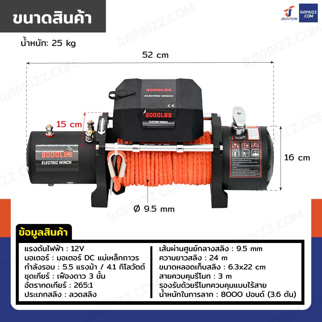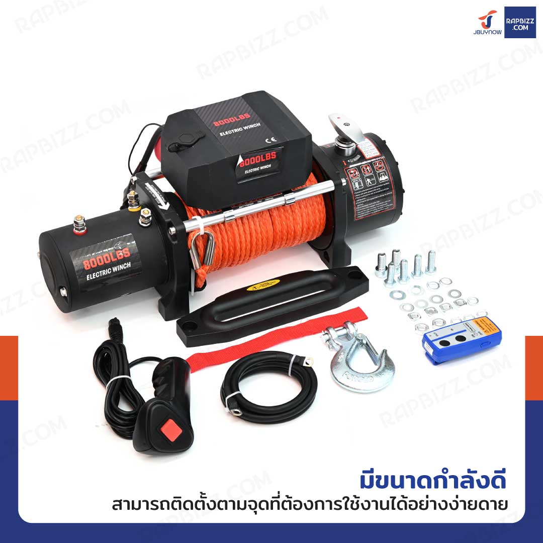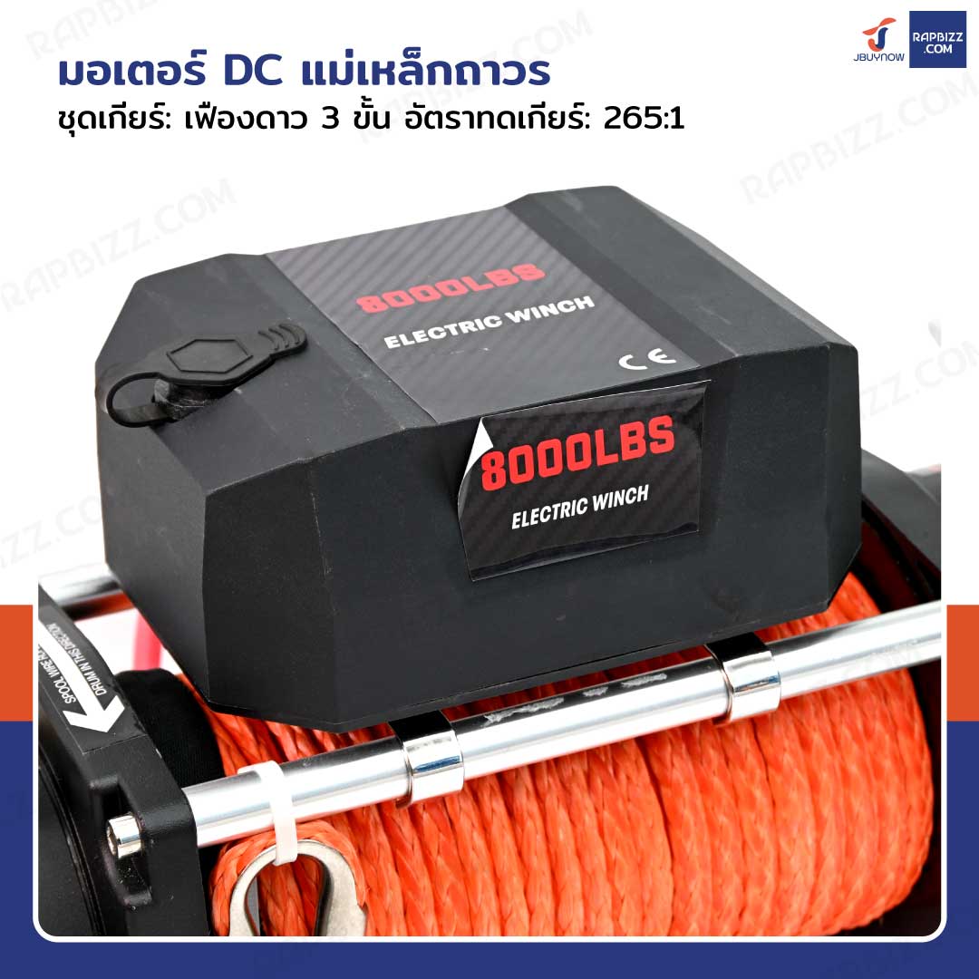 วินซ์ติดรถ 3.6 ตัน/8,000 ปอนด์ มีเกียร์ มอเตอร์ 5.5 hp/4.1Kw/12V เชือกส้ม 24M 8000LB