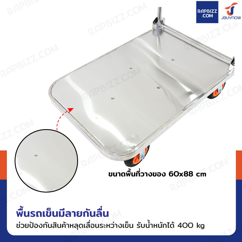 - พื้นรถเข็นมีลายกันลื่น ช่วยป้องกันสินค้าหลุดเลื่อนระหว่างเข็น