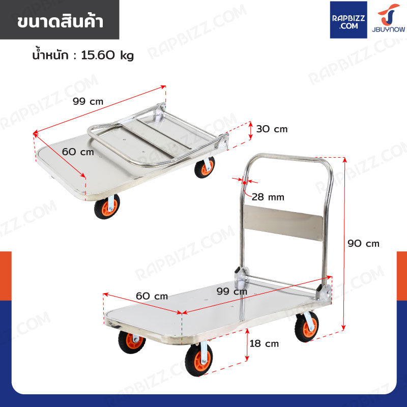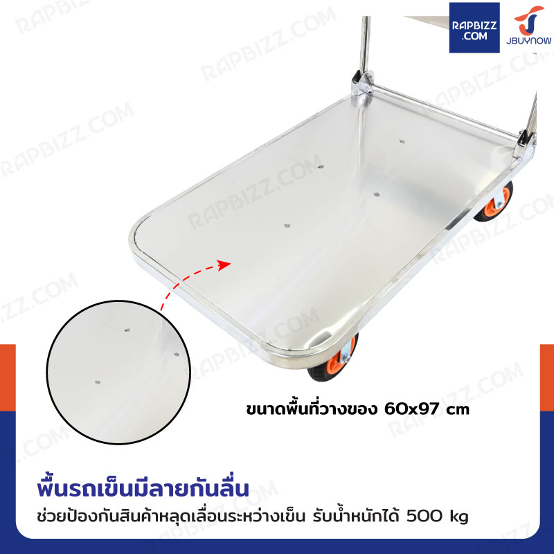 - พื้นรถเข็นมีลายกันลื่น ช่วยป้องกันสินค้าหลุดเลื่อนระหว่างเข็น