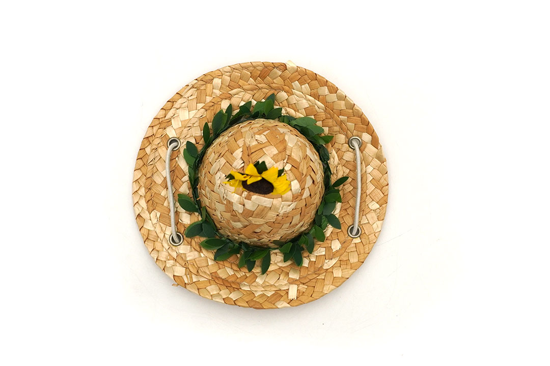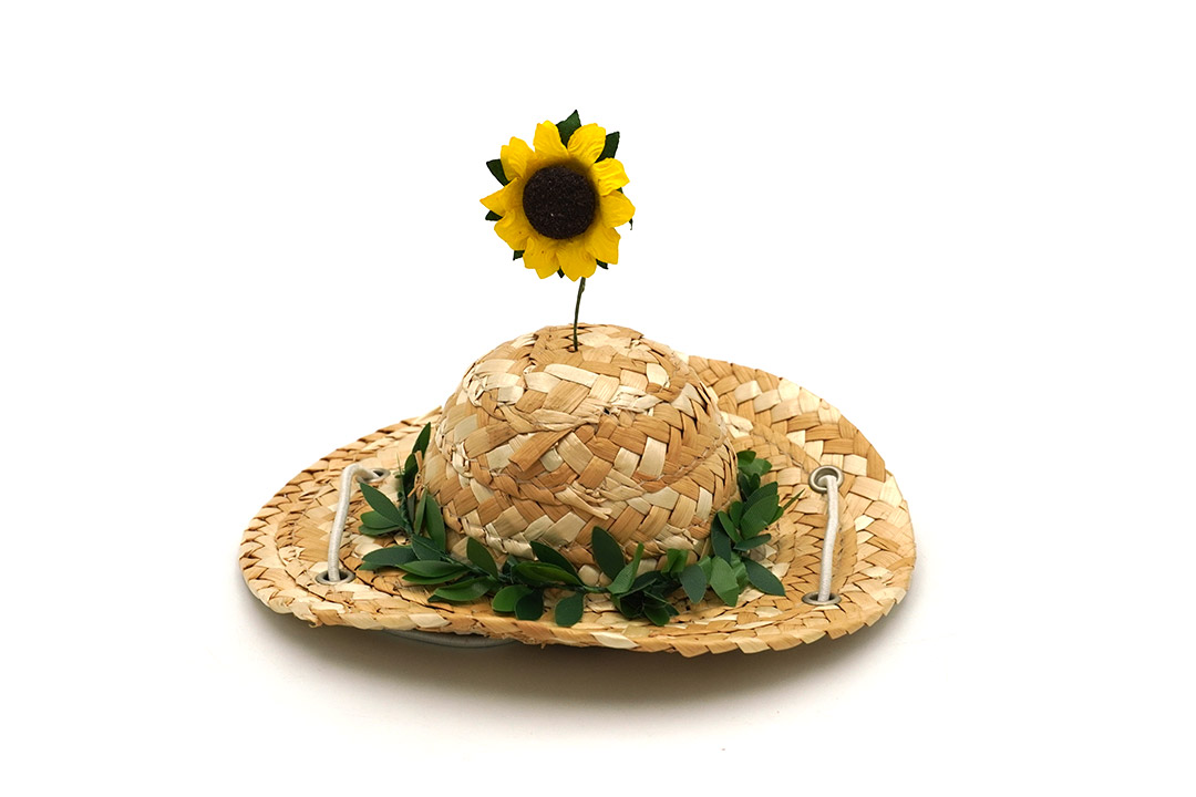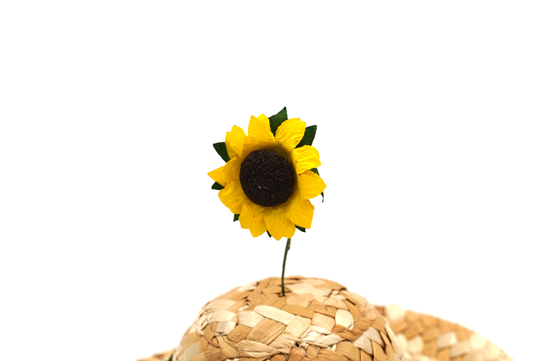 - หมวกฟางตกแต่งด้วยเถาใบไม้ปลอมและดอกทานตะวันสีสดใส