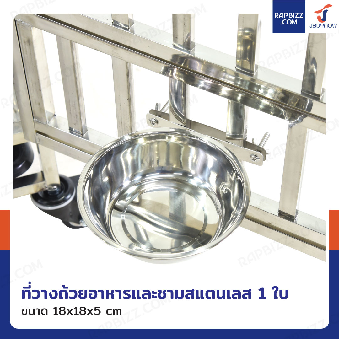 - มีที่วางถ้วยอาหารและชามสแตนเลสใส่อาหารให้ 1 ใบ