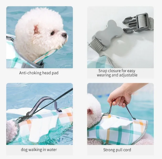 - เสื้อชูชีพสุนัขมาพร้อมกับที่จับช่วยเหลือด้านบน สามารถช่วยเหลือสุนัขได้หากสุนัขตกลงไปในน้ำ