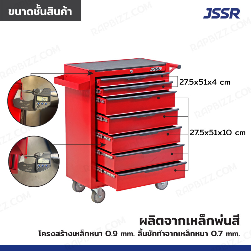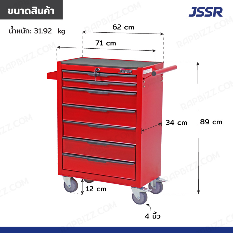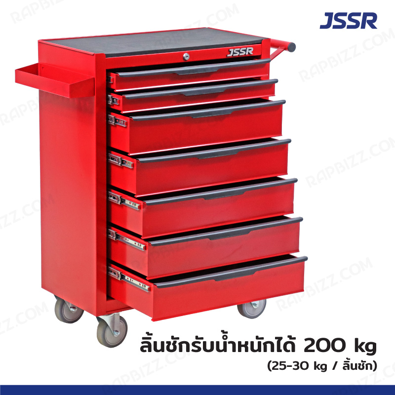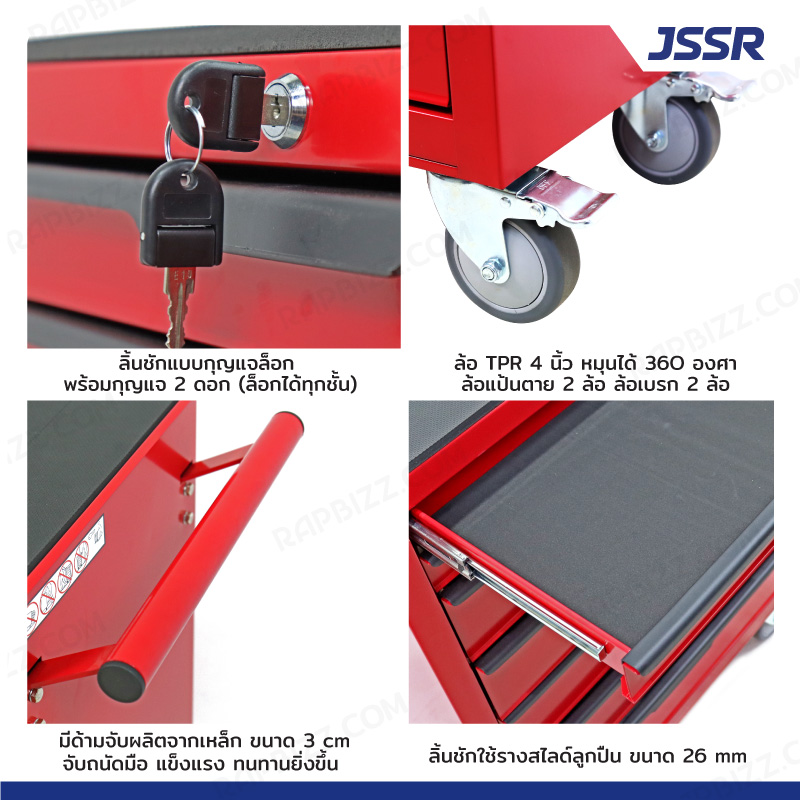 JSSR ตู้เครื่องมือ 7 ลิ้นชัก มีกุญแจล็อค 34x71x89 CM สีแดง รุ่นล้อใหญ่ 4 นิ้ว(เสียงเงียบ)