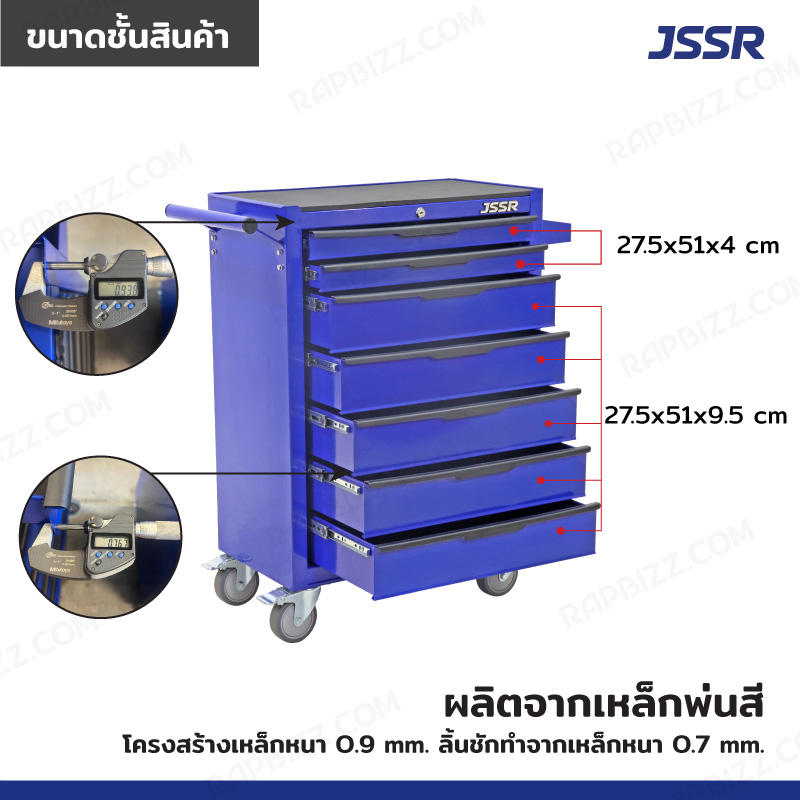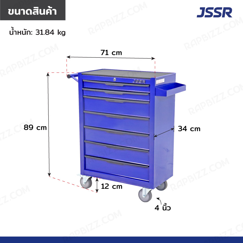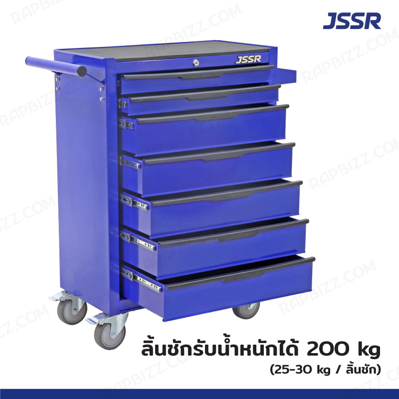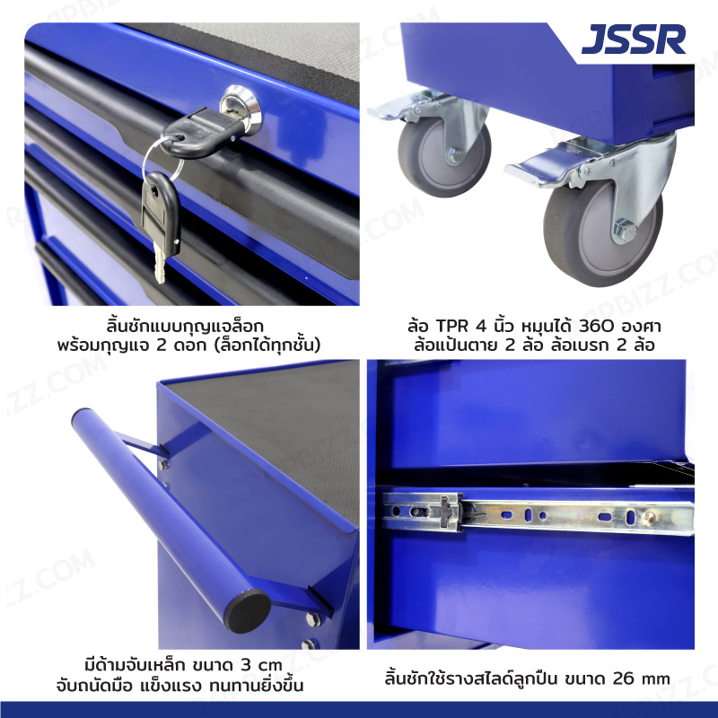 JSSR ตู้เครื่องมือ 7 ลิ้นชัก มีกุญแจล็อค 34x71x89 CM สีน้ำเงิน รุ่นล้อใหญ่ 4 นิ้ว (เสียงเงียบ)