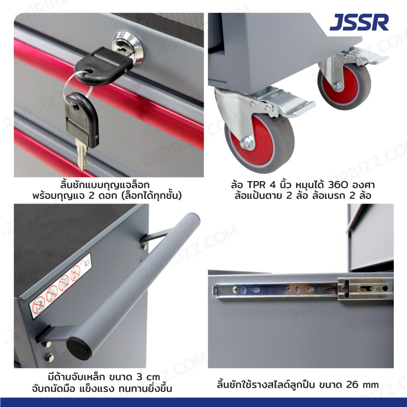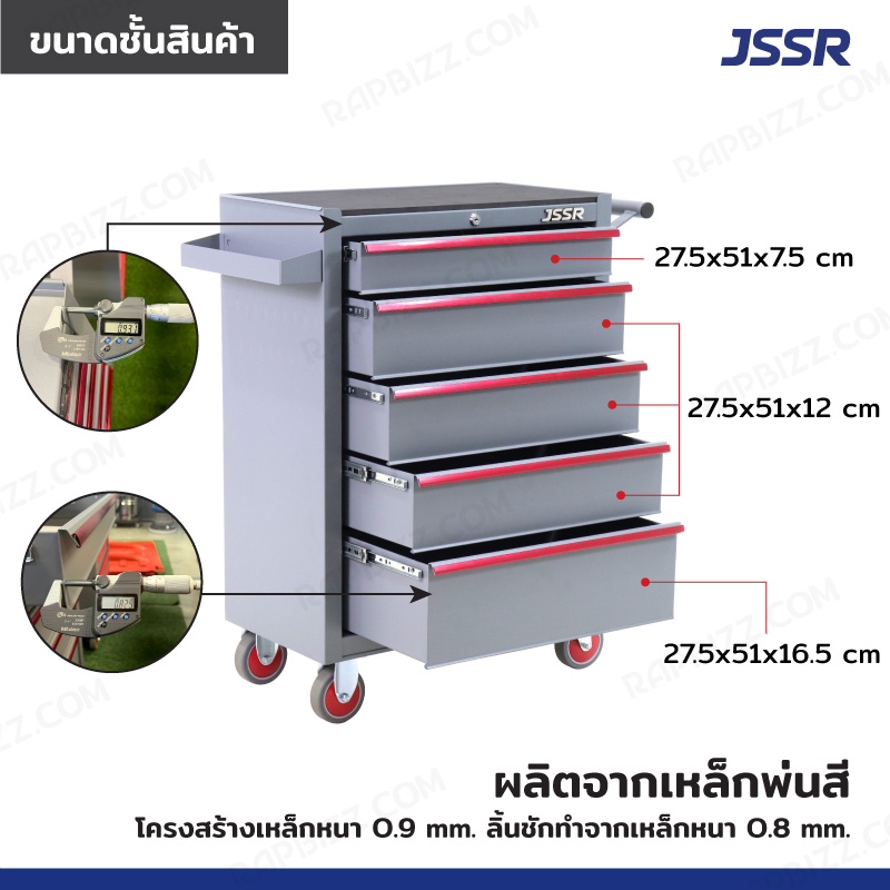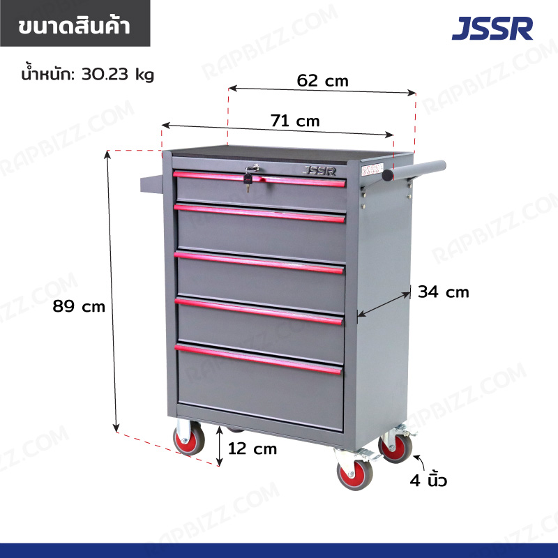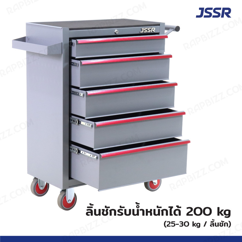 JSSR ตู้เครื่องมือ 5 ลิ้นชัก มีกุญแจล็อค 34x71x89 CM สีเทา รุ่นล้อใหญ่ 4 นิ้ว (เสียงเงียบ)