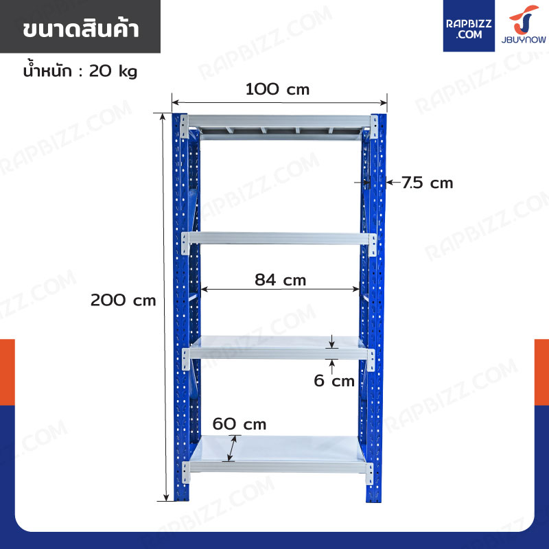 ชั้นวางของ 4 ชั้น 60x100x200 cm สีขาว-น้ำเงิน รับน้ำหนัก 150 kg รุ่นขาประกอบ