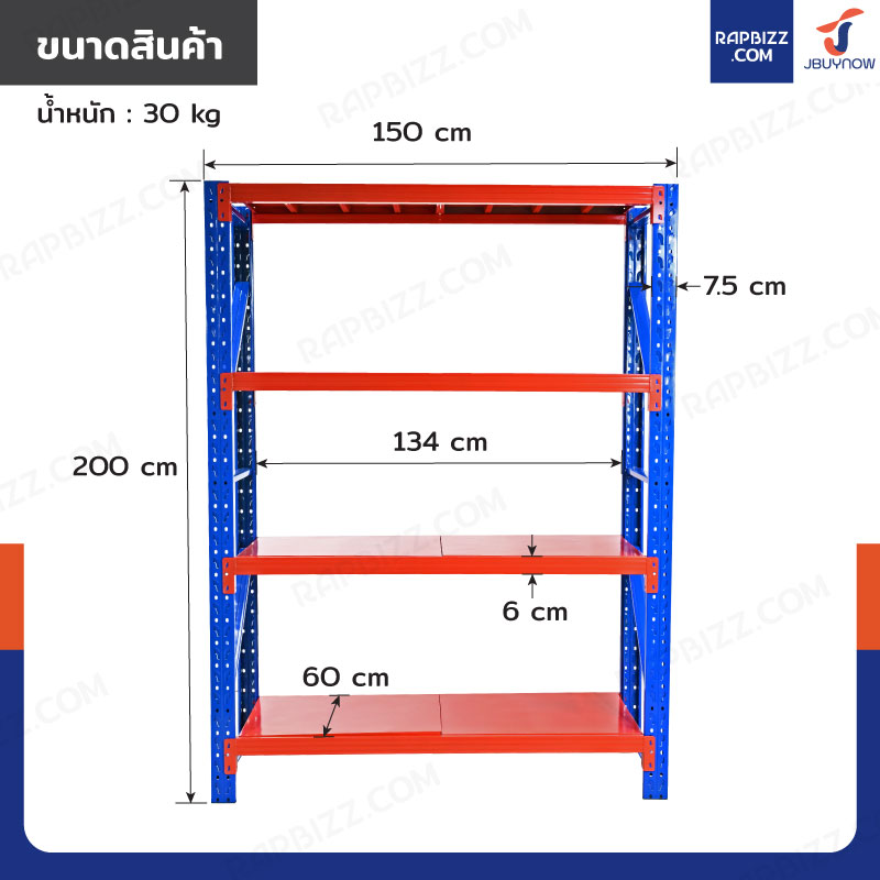 ชั้นวางของ 4 ชั้น 60x150x200 cm สีส้ม-น้ำเงิน รับน้ำหนัก 150 kg รุ่นขาประกอบ